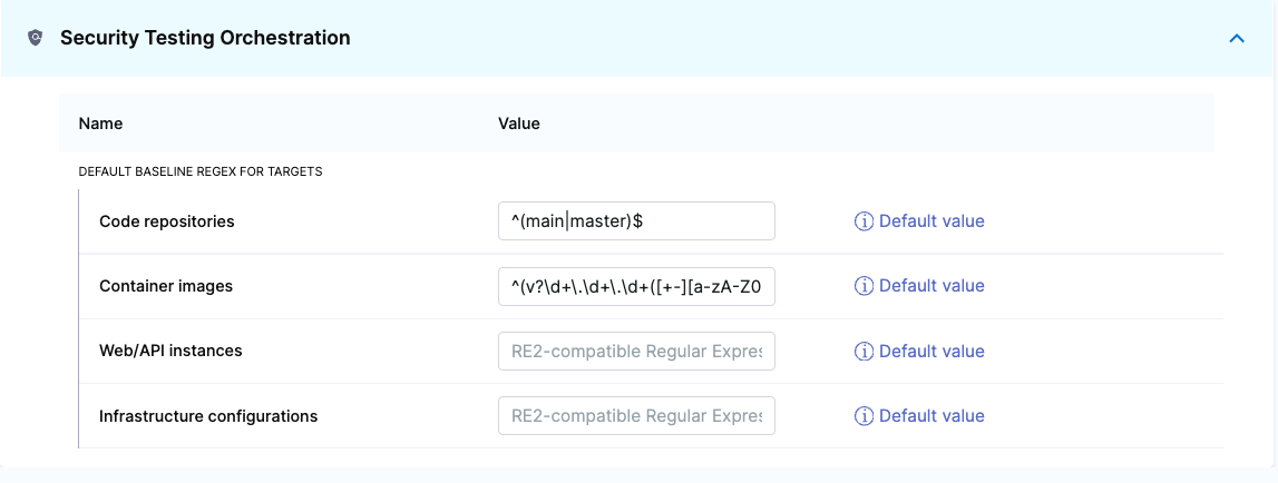 You can specify default baselines for specific target types: code repositories, container images, web/API instances, and infrastructure configurations. STO includes a set of predefined defaults for repository and container image targets.