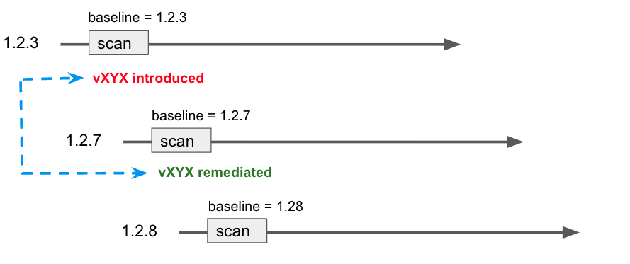 is created. You scan this branch, which matches your RegEx, and it becomes the current baseline. - The scan detects a new vulnerability, vXYZ, with a severity of MEDIUM.